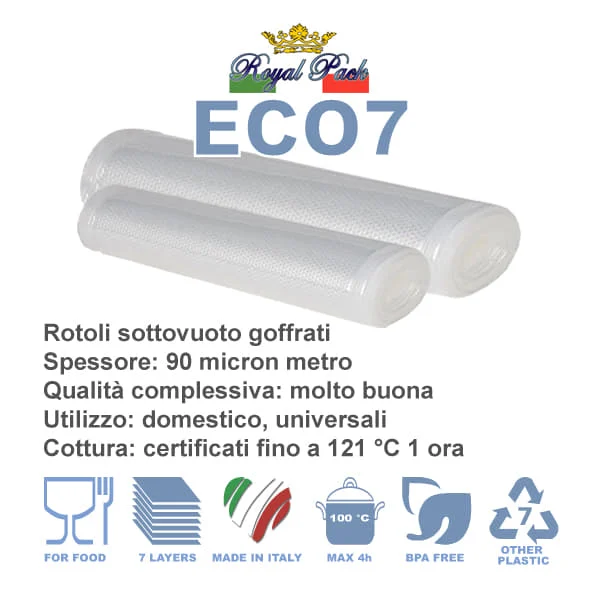 Royal Pack Eco7 universal embossed vacuum rolls, thickness 90 micron meter on the embossed side. They are offered in packs of two pieces.